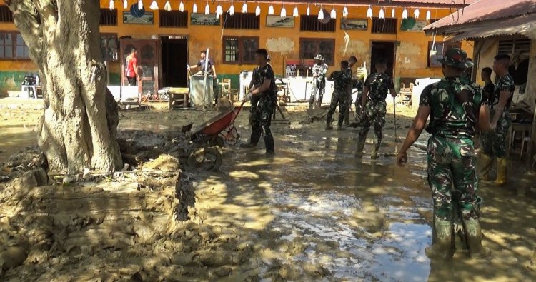 Aceh Tamiang - Taruna Akademi TNI yang tergabung dalam Satuan Tugas Taruna (Satgastar) Latihan Integrasi Taruna Wreda Nusantara (Latsitarda Nusantara) ke-46 melaksanakan kegiatan karya bakti pembersihan di SD Negeri 1 Tualang Cut, Kecamatan Manyak Payed dan SD Negeri Rantau Pauh, Kecamatan Rantau, Kabupaten Aceh Tamiang, Sabtu (17/1/2026). Kegiatan ini merupakan bagian dari pengabdian Taruna Akademi TNI kepada masyarakat dalam rangka membantu pemulihan wilayah pascabencana banjir.