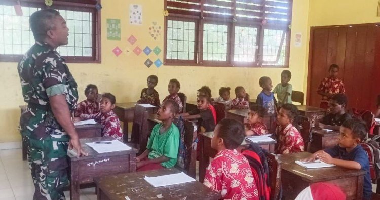 Timika - Dalam upaya menumbuhkan semangat nasionalisme sejak usia dini, Babinsa Koramil 1710-07/Mapurujaya, Kodim 1710/Mimika, Peltu Hermanus Resubun, memberikan pembekalan Wawasan Kebangsaan (Wasbang) kepada para siswa SD YPPK Kaugapu, Distrik Mimika Timur, Jumat (31/10/2025).