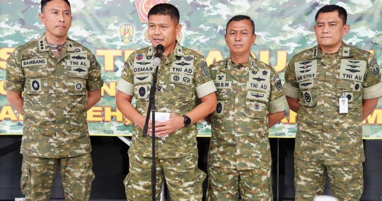Jakarta - Wakil Kepala Pusat Penerangan TNI Brigjen TNI Osmar Silalahi, didampingi Sekretaris Dispenad Kolonel Inf Heri Bambang Wahyudi, Kasubdispenum Dispenal Kolonel Laut (P) Bambang Budi Raharjo, dan Kasubdispenum Dispenau Kolonel Pnb Didik Setiya Nugroho, menyampaikan perkembangan terbaru pelibatan TNI dalam operasi penanggulangan bencana di Provinsi Aceh, Sumatera Utara, dan Sumatera Barat. Keterangan pers disampaikan di Lanud Halim Perdanakusuma, Jakarta Timur, Selasa (9/12/2025).