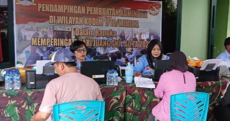 Timika - Dalam rangka memperingati Hari Juang TNI AD, Kodim 1710/Mimika melalui Koramil 1710-02/Timika menggelar kegiatan pendampingan pembuatan administrasi kependudukan (Adminduk) bagi masyarakat, bertempat di Makoramil 1710-02/Timika, Jalan Yos Sudarso, Jumat (5/12/2025).