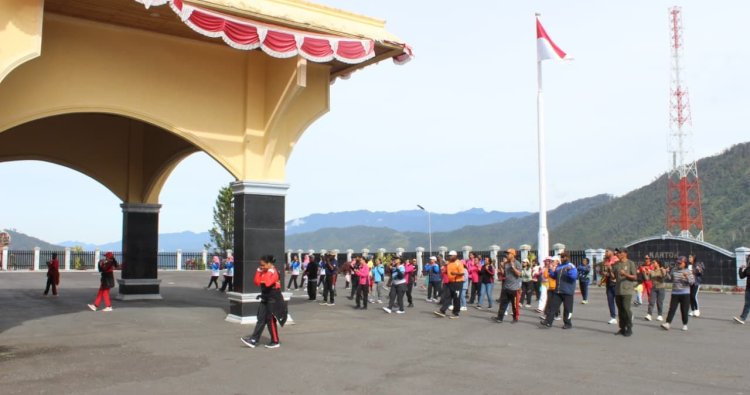 Mulia - Kodim 1714/Puncak Jaya dan Persit Kartika Chandra Kirana mengikuti olahraga bersama dengan jajaran pemerintah daerah Kabupaten Puncak Jaya pada Jumat (23/01/2025).