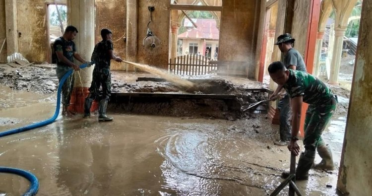 Kegiatan pembersihan dilaksanakan secara intensif dengan memanfaatkan peralatan manual serta mesin semprot air bertekanan tinggi untuk mengangkat lumpur yang menempel pada lantai, dinding, dan bagian bangunan lainnya. Suasana gotong royong dan kebersamaan tampak kuat, mencerminkan sinergi yang solid antara TNI dan masyarakat dalam menghadapi dampak bencana.