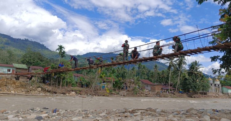 Aceh Tenggara - Prajurit TNI dari Posramil Darul Hasanah, Kodim 0108/Aceh Tenggara, Korem 011/Lilawangsa, Kodam Iskandar Muda, bersama masyarakat Desa Buntul Kendawi, Kecamatan Darul Hasanah, Kabupaten Aceh Tenggara, melaksanakan perbaikan jembatan gantung yang rusak akibat banjir dan sempat memutus akses warga.