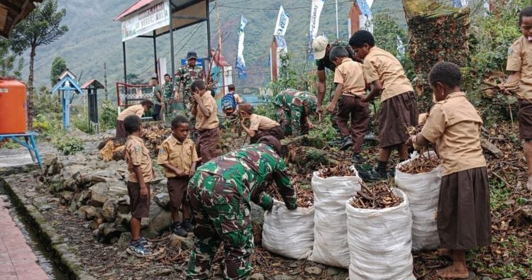 Puncak Jaya - Babinsa Koramil 1714-01/Mulia Kodim 1714/Puncak Jaya bersama siswa dan siswi SDN 1/Mulia Kabupaten Puncak Jaya bergotong royong membersihkan tumpukan sampah di sekitar ruang kelas pada Sabtu (14/02/ 2026).
