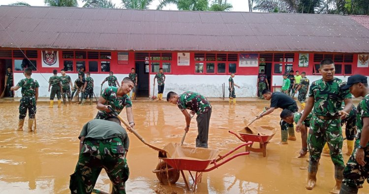 Prajurit bersama personel Kodim 0211/Tapanuli Tengah dan pihak sekolah bergotong royong mengangkat lumpur, membersihkan sisa material banjir, serta memulihkan akses dan halaman sekolah menggunakan peralatan manual guna mempercepat pemulihan.