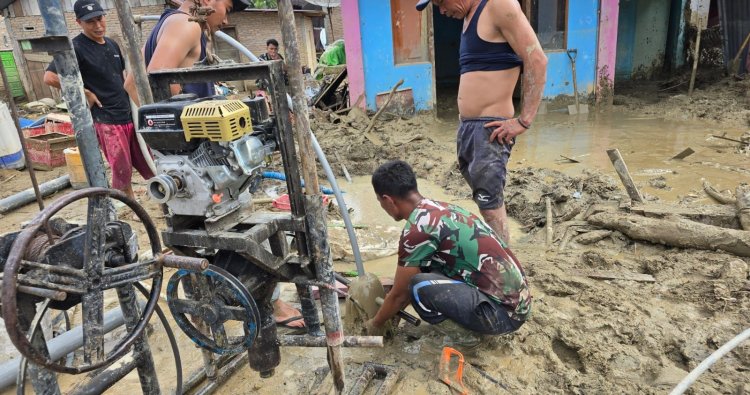 Sumut - TNI melalui Kodim 0212/Tapanuli Utara bersama masyarakat melaksanakan pembangunan sumur bor guna memenuhi kebutuhan air bersih bagi warga terdampak banjir di Desa Huta Godang, Kecamatan Batang Toru, Kabupaten Tapanuli Selatan, Sumatera Utara, Minggu (14/12/2025).
